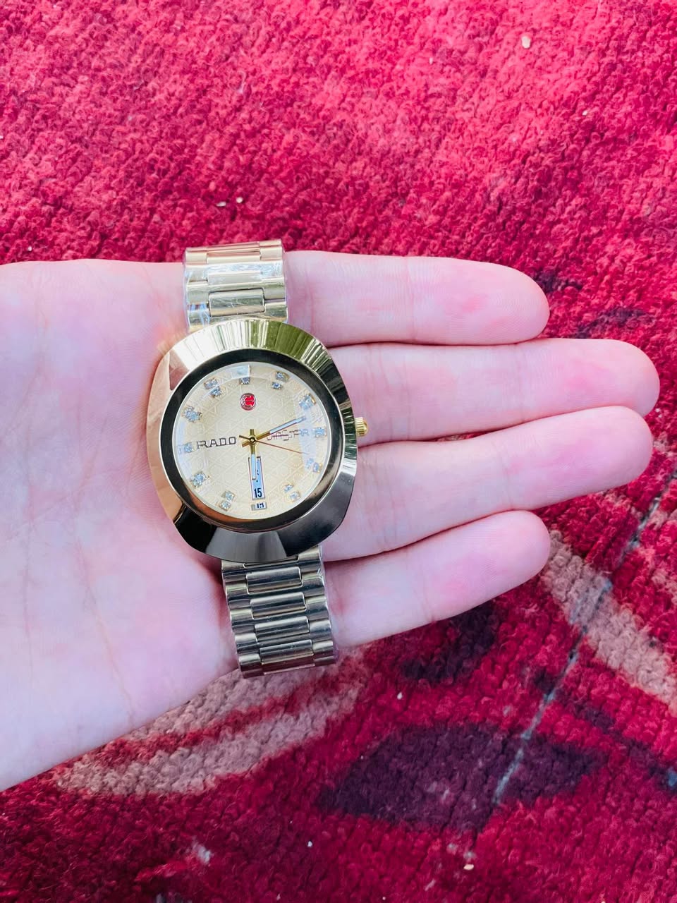 ساعت زیبای رادو RADO ⌚️ ساخت کشور سویس SWISS رنگ طلایی صدفیصد ضد آب چک در آب با بند خیلی زیبا تاریخ و هفته نما قیمت ۲۲۰۰ با جور آمد ادرس کابل 0745843475شماره تماس و وتس اپ